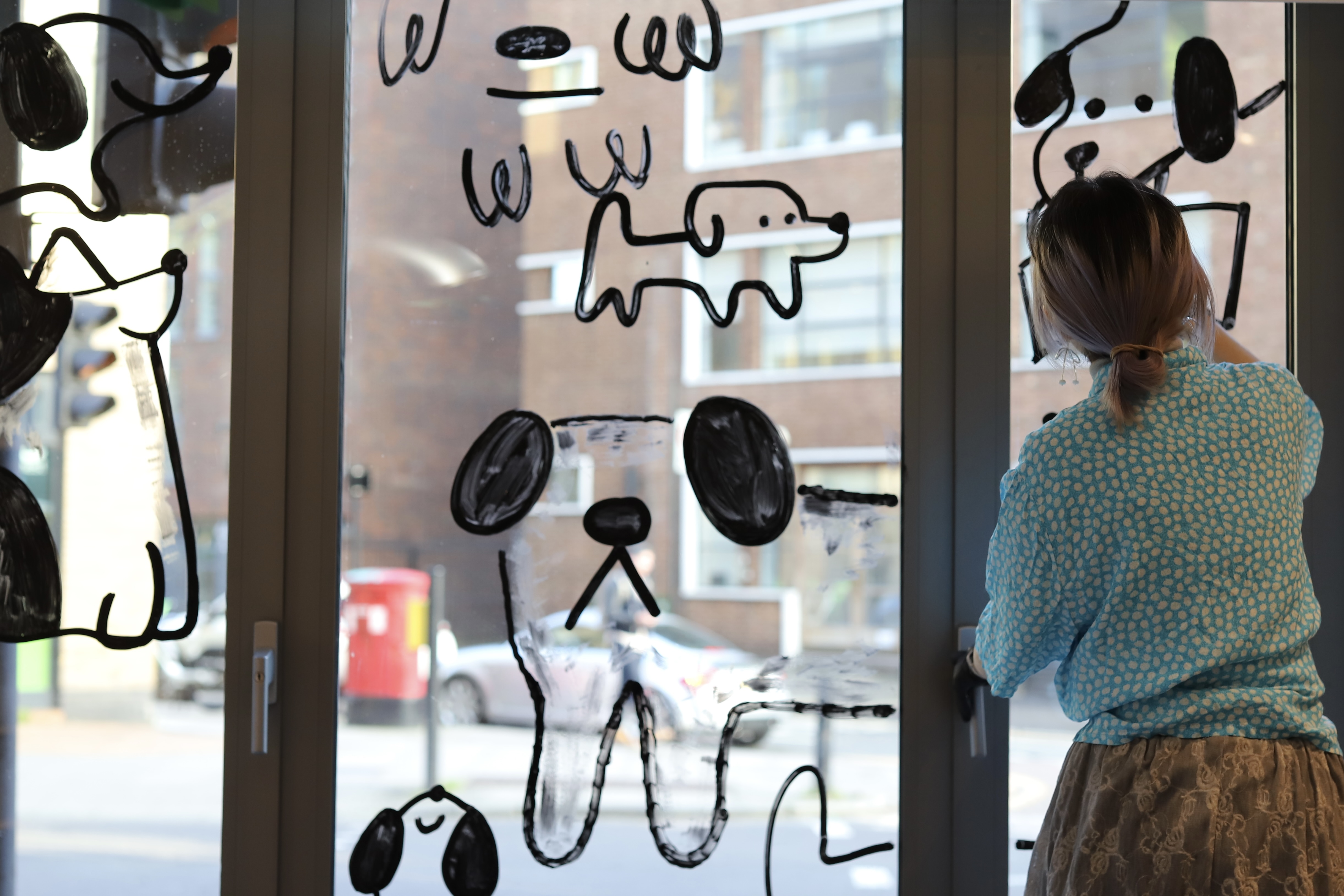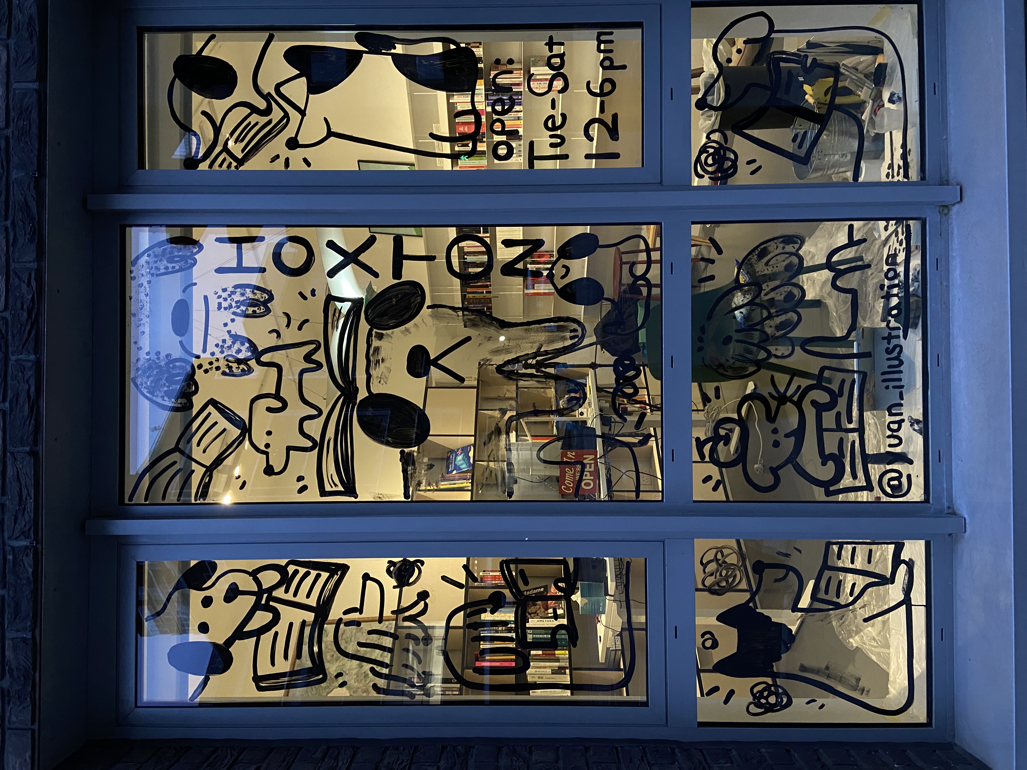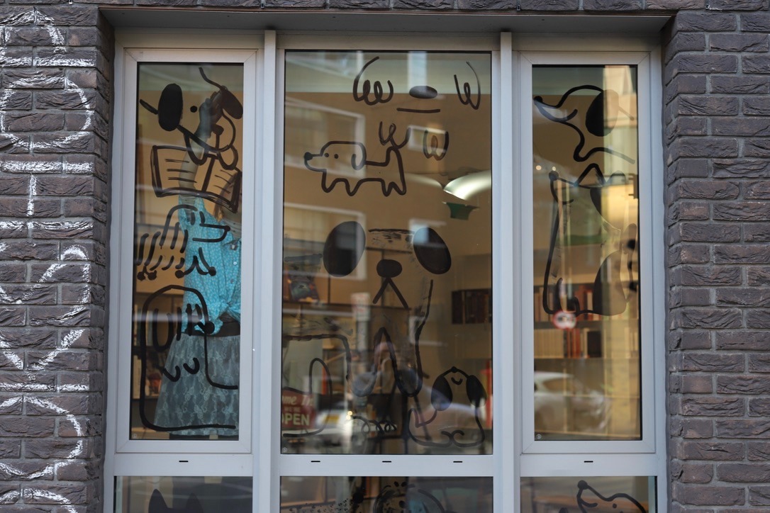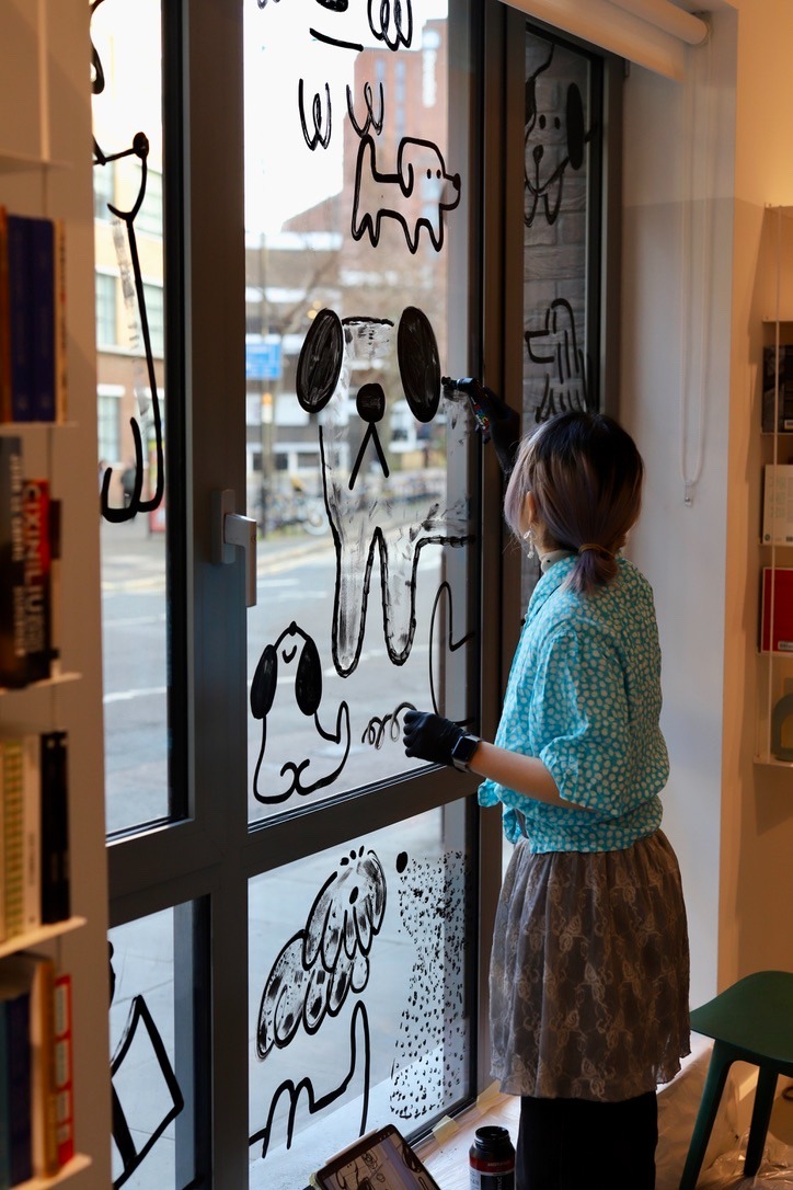 The Glass drawing is for Hoxton Books, a bookshop in East London. I drew many dogs reading books together. The loose and playful lines create a relaxed atmosphere, which is also the atmosphere of the bookshop. In the glass drawing, I used different mark-making techniques to create different types of dogs, just like the vibrant and colorful London community. I also tried to use my drawing to show that reading can be relaxed and fun!