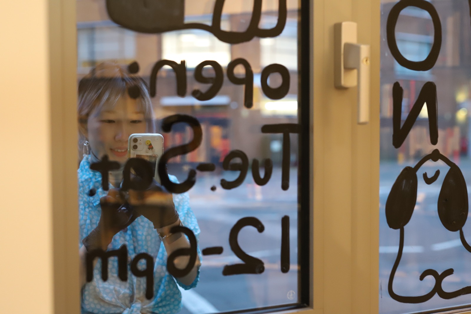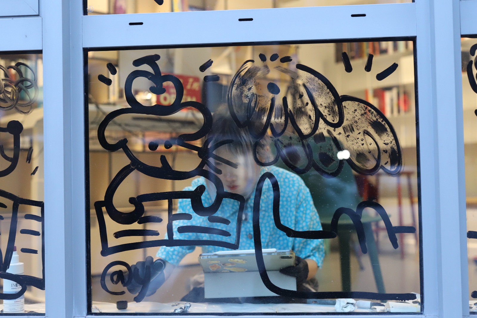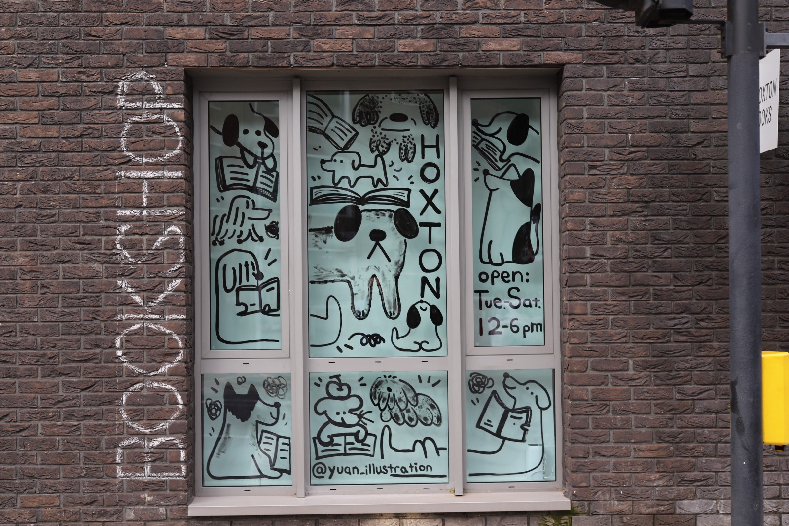 The Glass drawing is for Hoxton Books, a bookshop in East London. I drew many dogs reading books together. The loose and playful lines create a relaxed atmosphere, which is also the atmosphere of the bookshop. In the glass drawing, I used different mark-making techniques to create different types of dogs, just like the vibrant and colorful London community. I also tried to use my drawing to show that reading can be relaxed and fun!